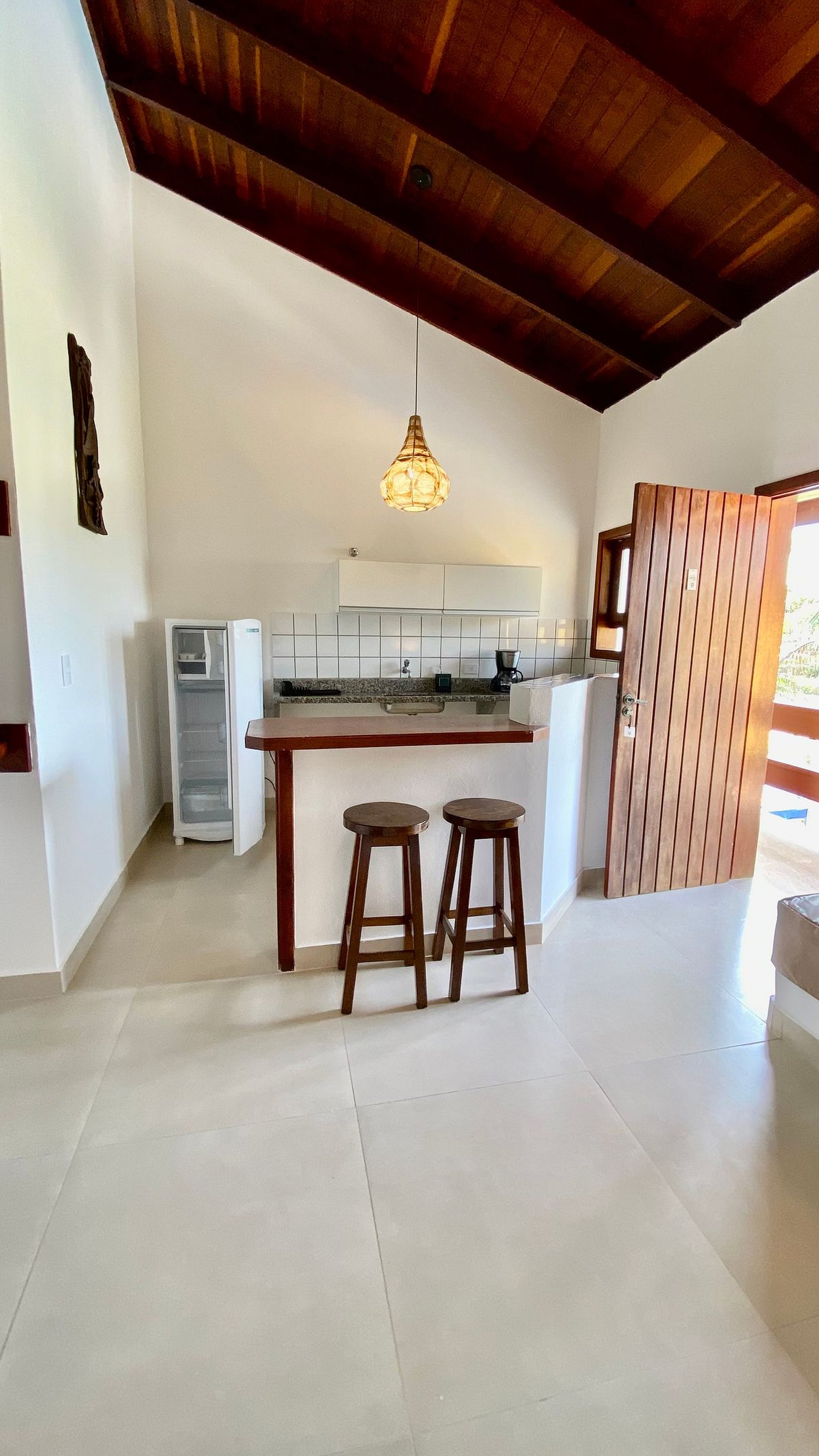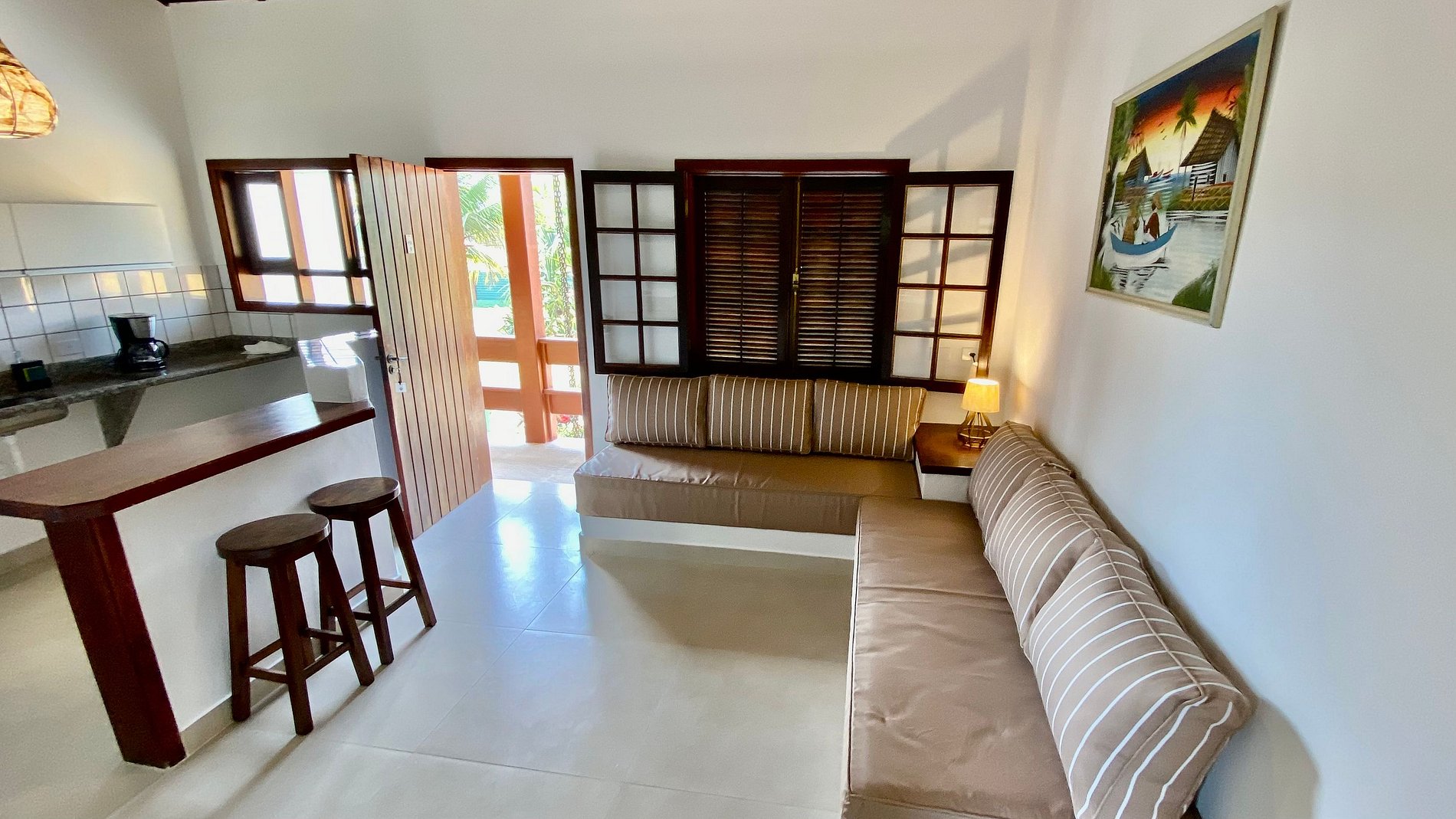 O apto apresenta sala com 2 sofás ( que são 2 camas de solteiro ), Tv Vivo 90 canais e ventilador de teto , wifi , cozinha americana ( prato,copos,talheres ), geladeira, cafeteira, microondas, banheiro, quarto cama de casa queen, ar condicionado e ventilador de teto. Este apto acomoda até 4 pessoas e fica no piso superior.