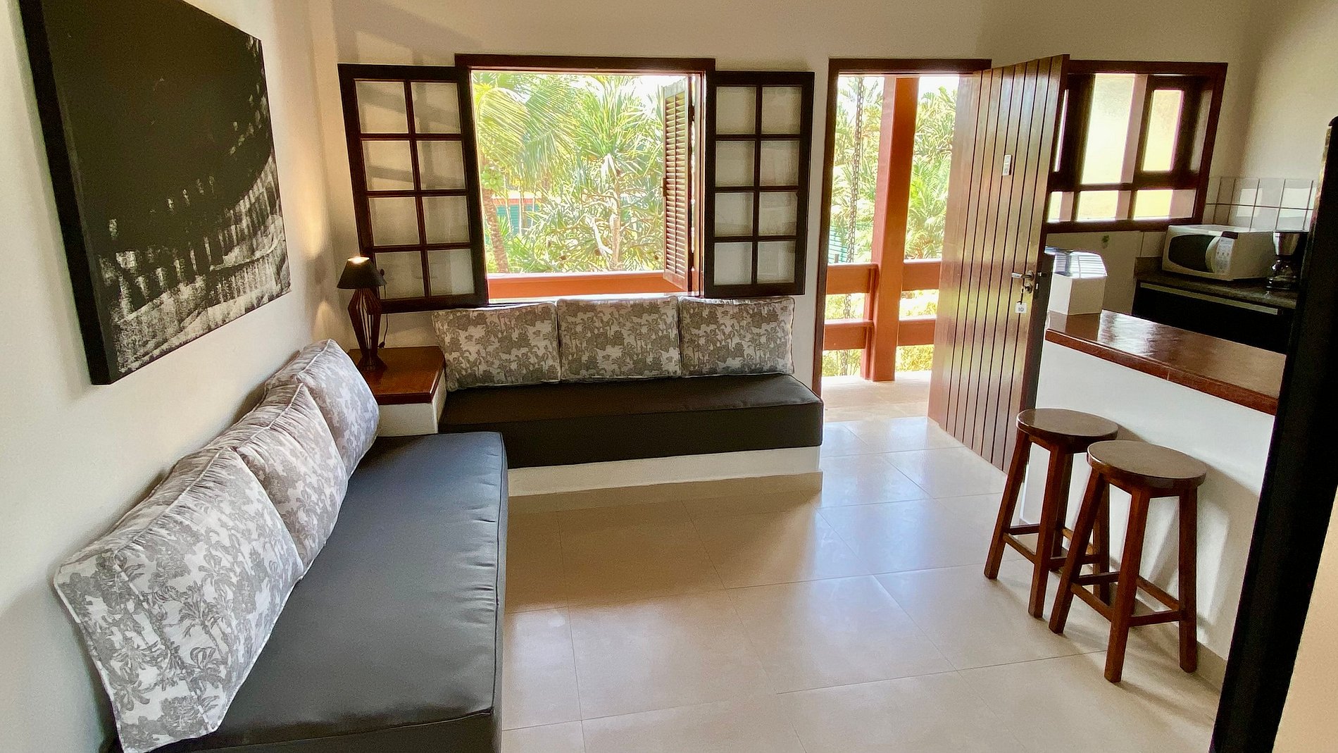 O apto apresenta sala com 2 sofás ( que são 2 camas de solteiro ), Tv Vivo 90 canais e ventilador de teto , wifi , cozinha americana ( prato,copos,talheres ), geladeira, cafeteira, microondas, banheiro, quarto cama de casal, ar condicionado e ventilador de teto. Acomoda até 4 pessoas, piso superior.