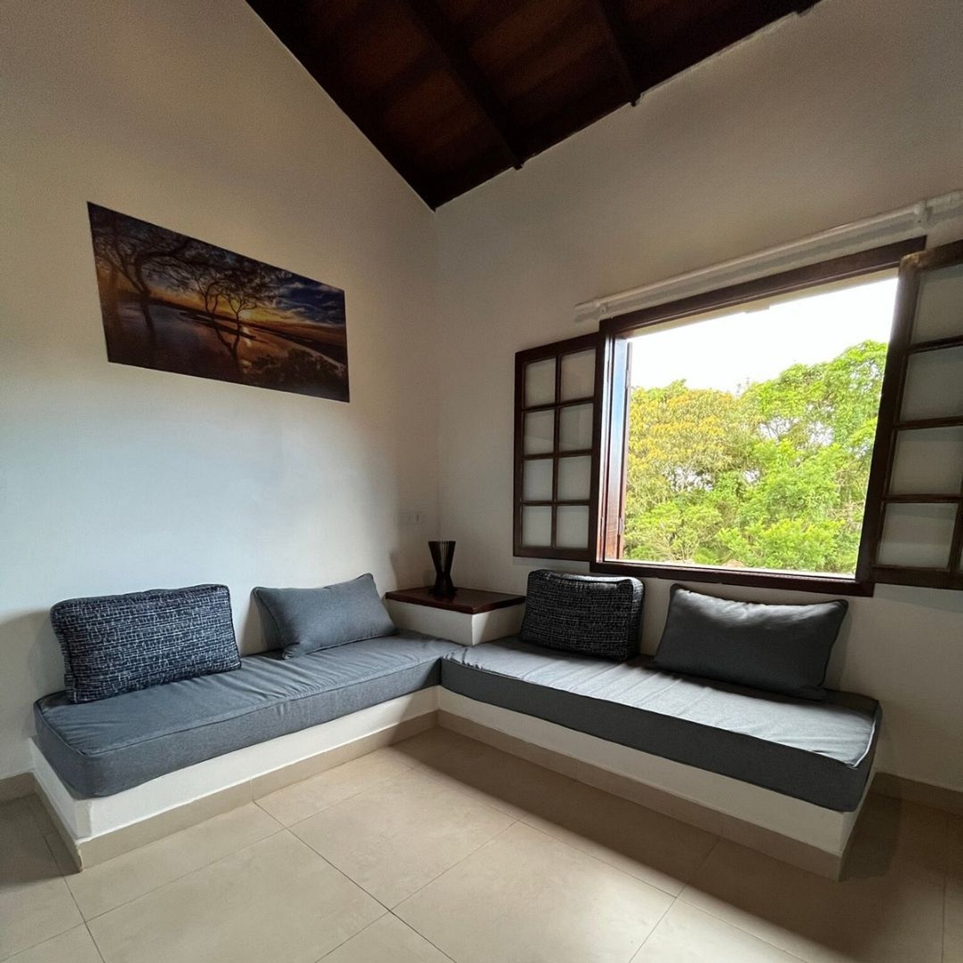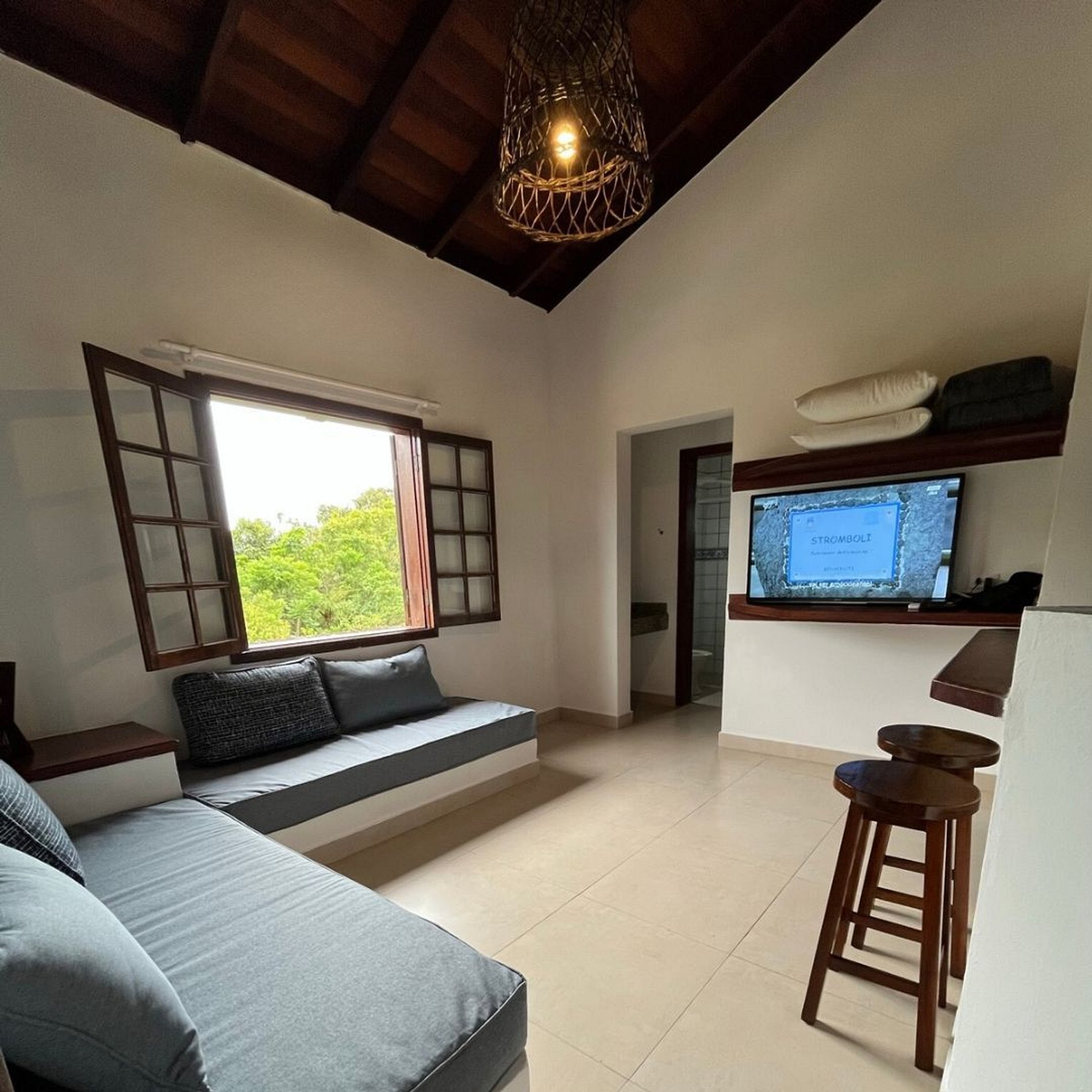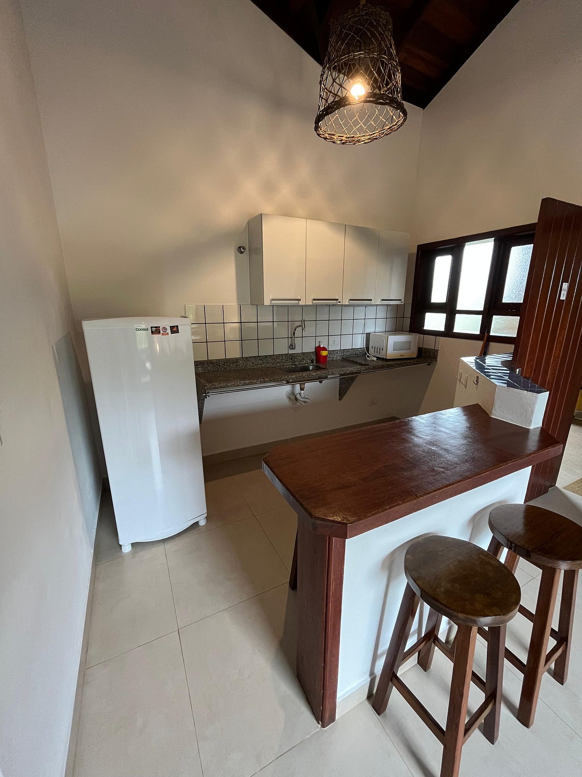 O apto apresenta sala com 2 sofás ( que são 2 camas de solteiro ), Tv Vivo 90 canais e ventilador de teto , wifi , cozinha americana ( prato,copos,talheres ), geladeira, cafeteira, microondas, banheiro, quarto cama de casa queen, ar condicionado e ventilador de teto. Este apto acomoda até 4 pessoas e fica no piso superior.
