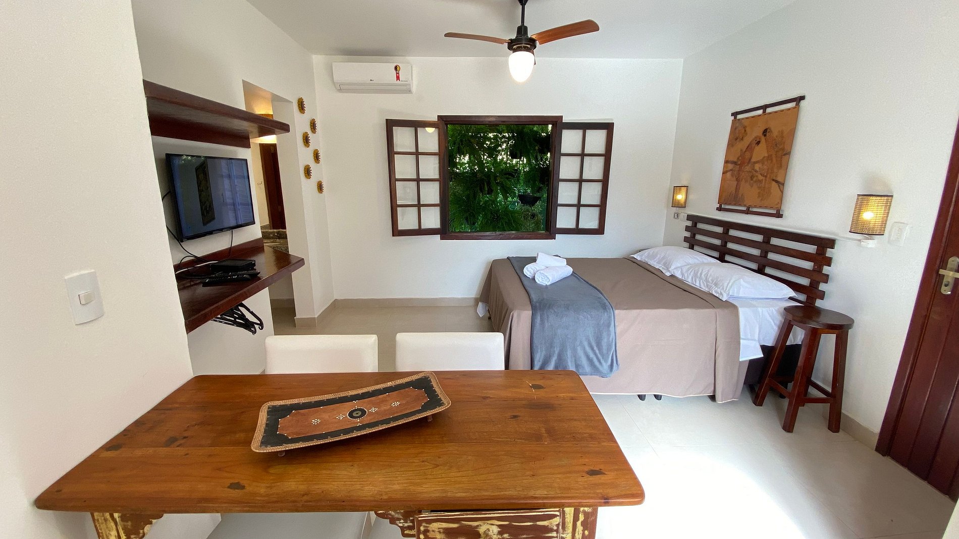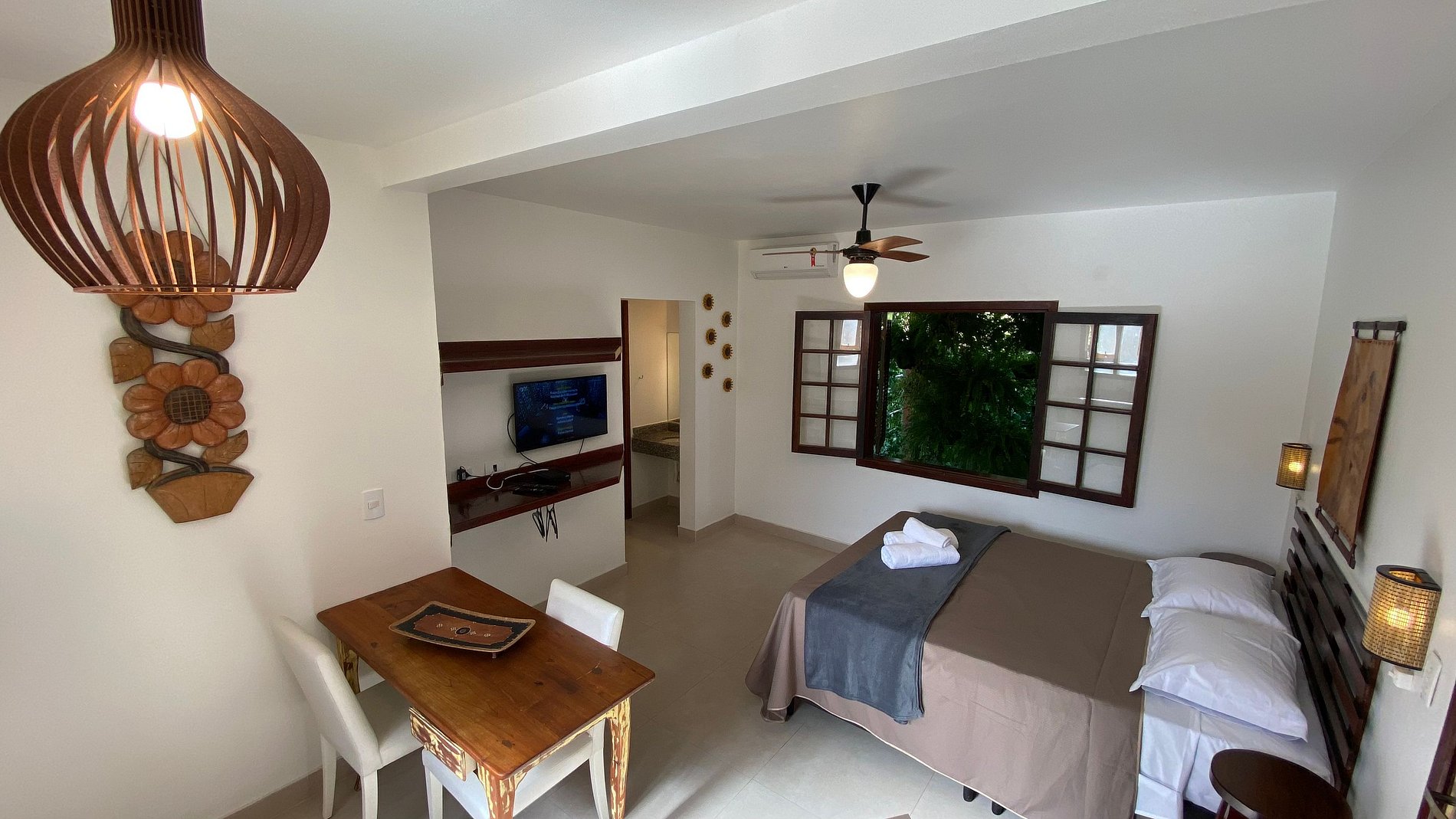 A suíte é composta por quarto com cama de casal queen, ar condicionado, TV vivo 90 canais , wi-fi , copa com frigobar, cafeteira, microondas , mesa , 2 cadeiras , banheiro.