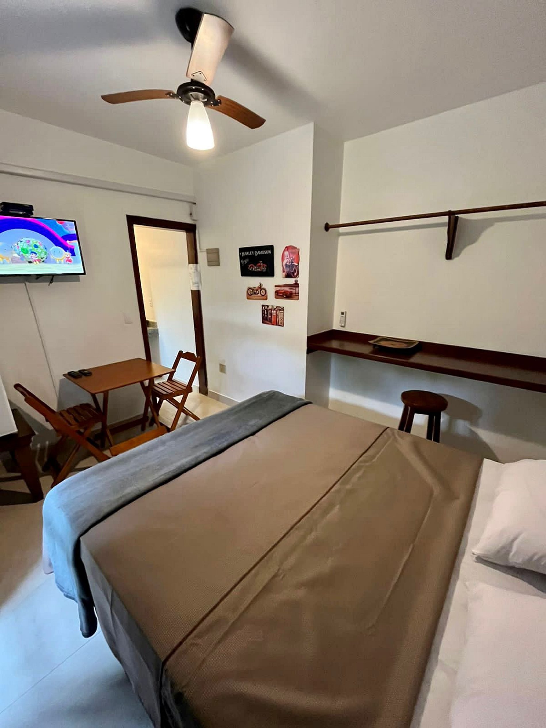 Suíte com cama queen, tv a cabo, wi-fi, ar condicionado, mesinha com 2 cadeiras, frigobar e banheiro, piso térreo.