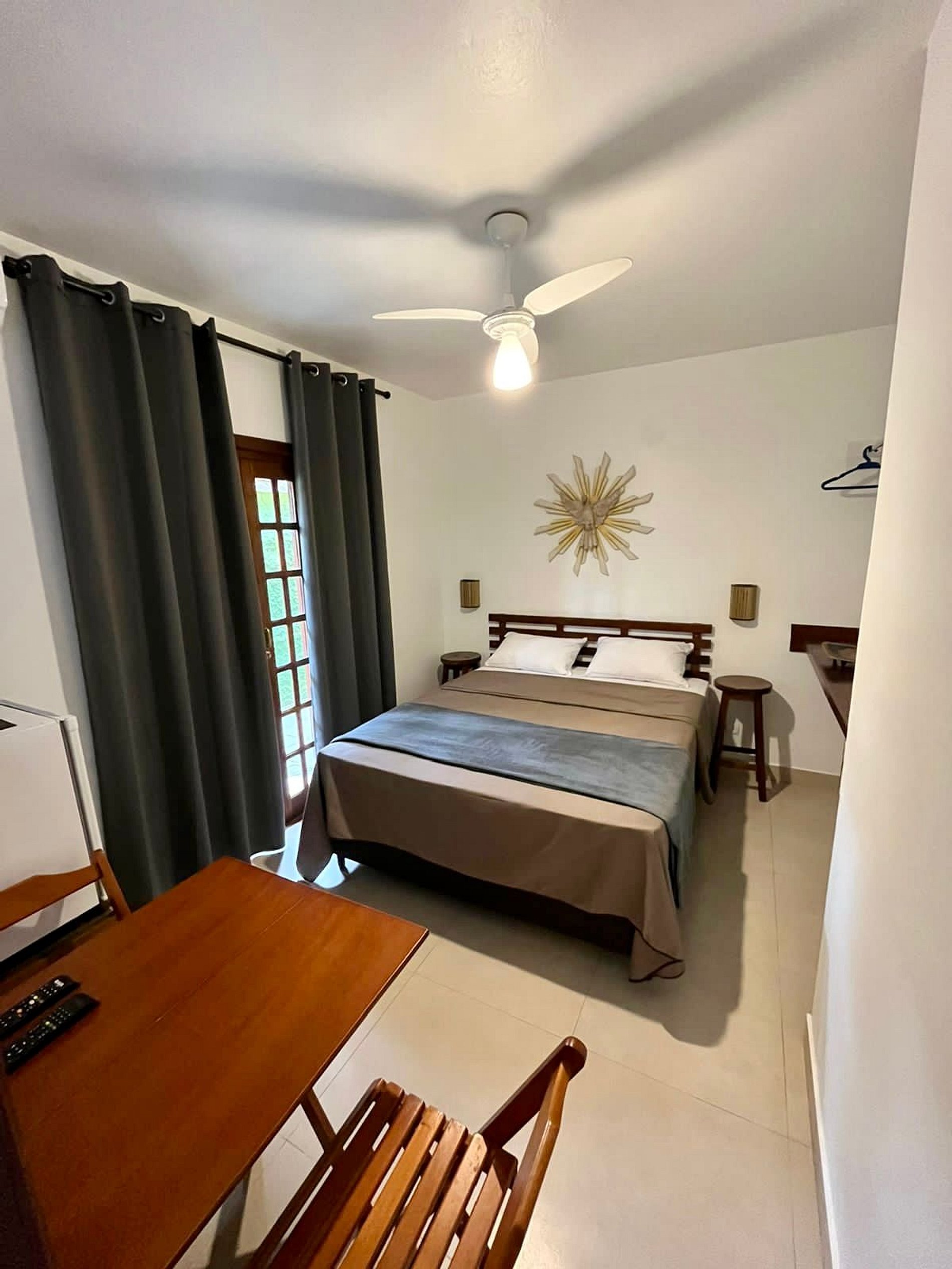 Suíte com cama queen, tv a cabo, wi-fi, ar condicionado, mesinha com 2 cadeiras, frigobar e banheiro, piso térreo.