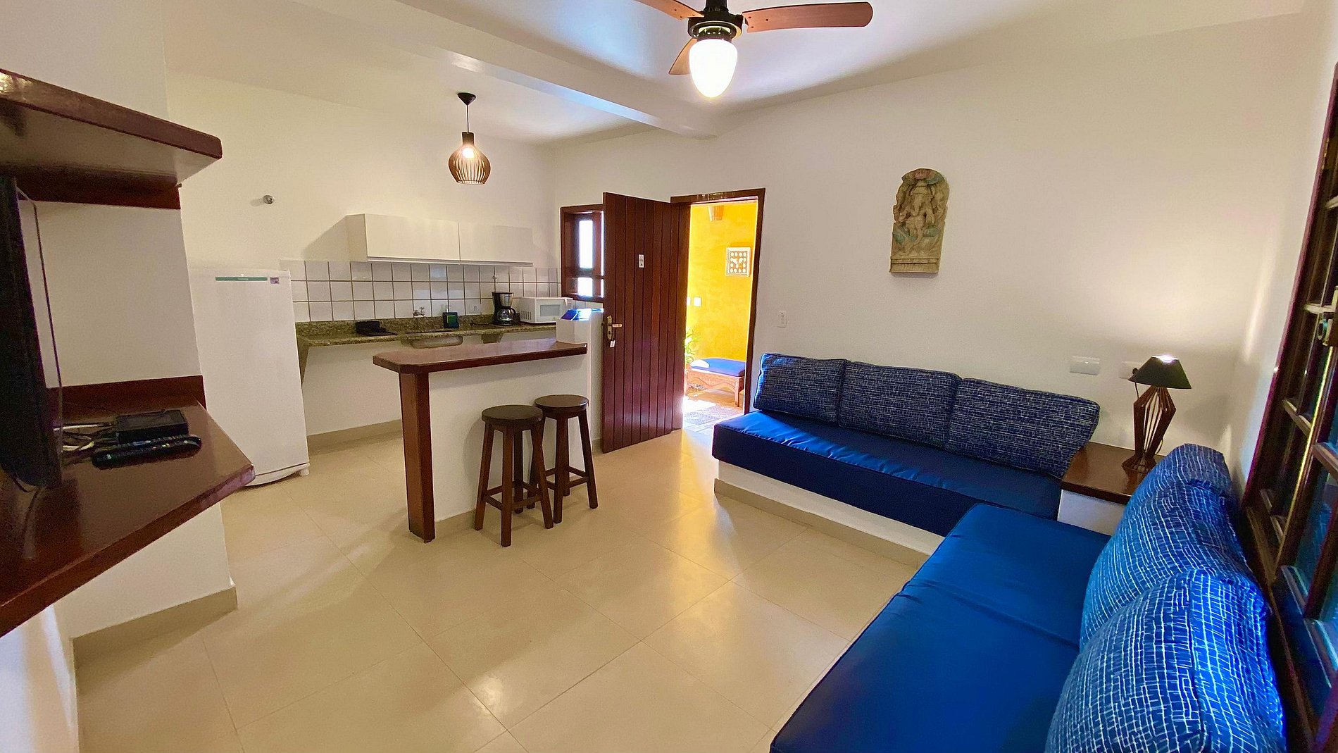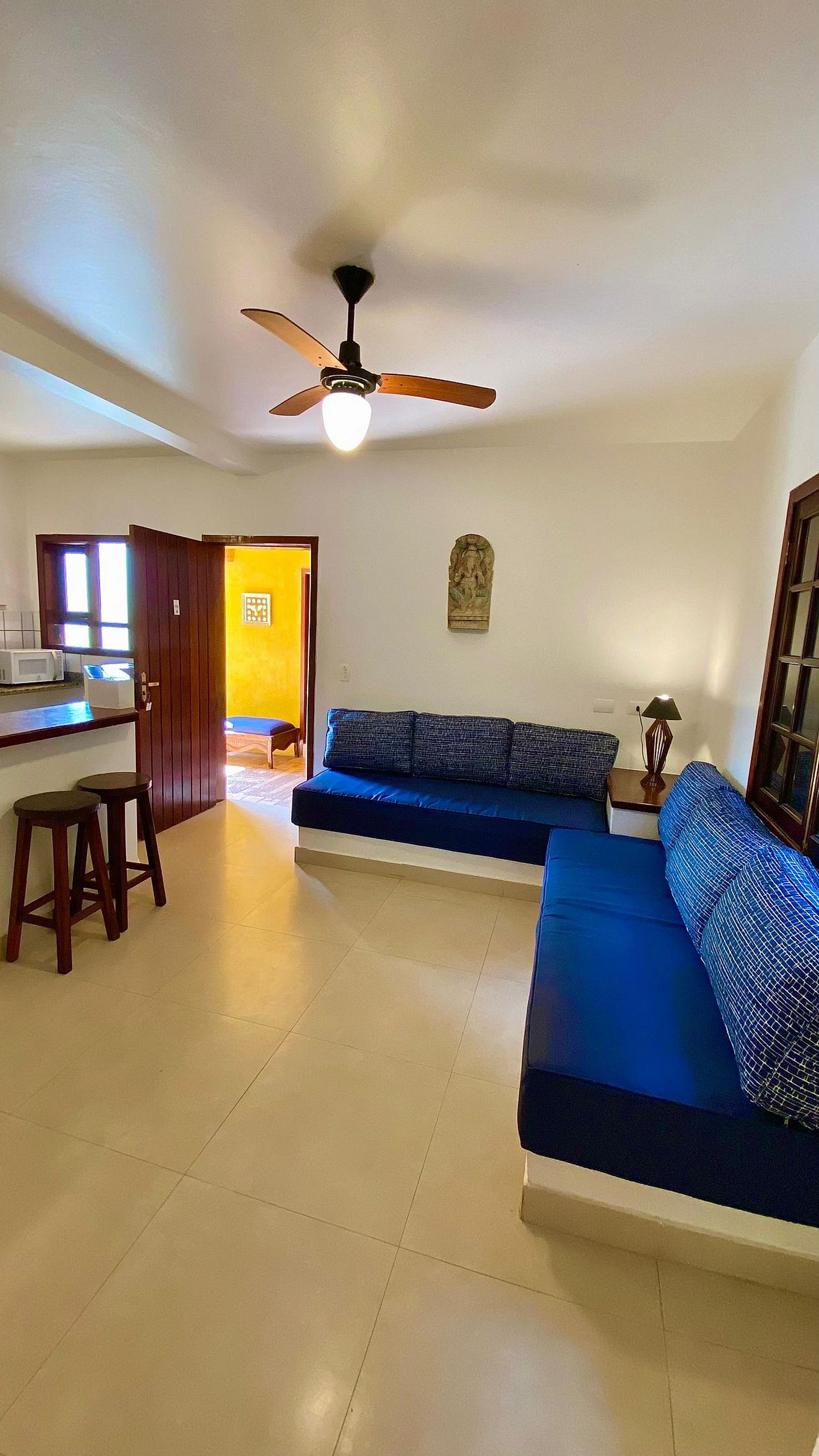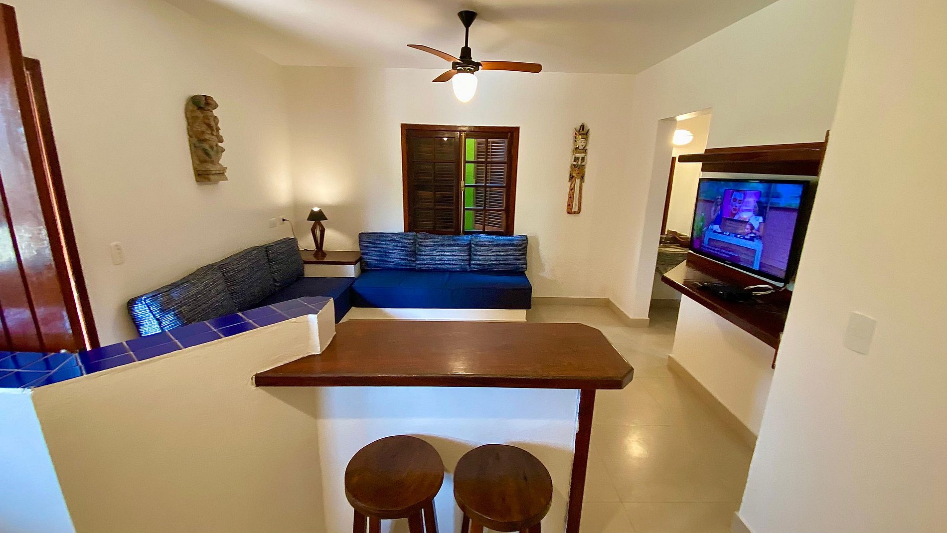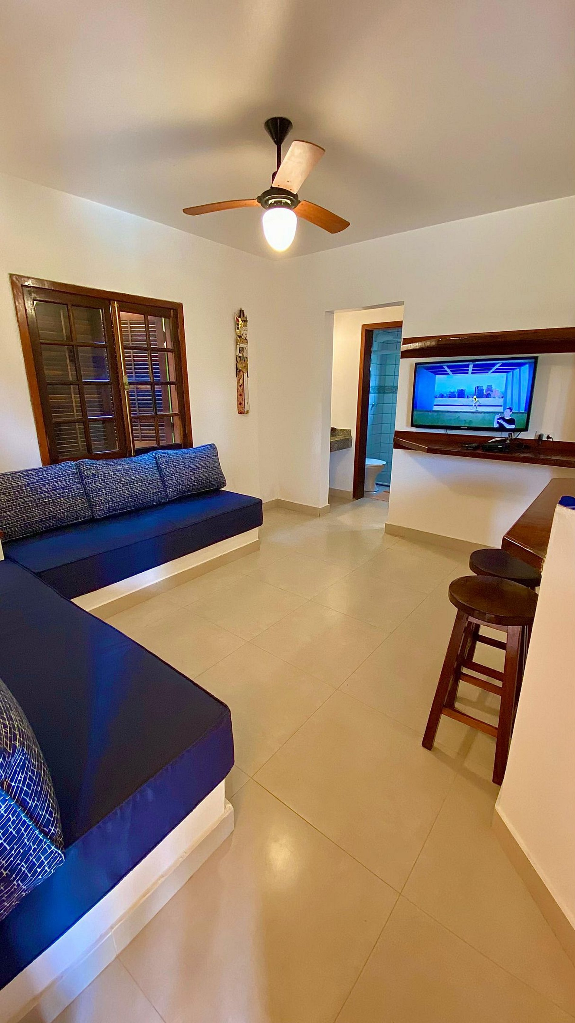O apto apresenta sala com 2 sofás ( que são 2 camas de solteiro ), Tv Vivo 90 canais e ventilador de teto , wifi , cozinha americana ( prato,copos,talheres ), geladeira, cafeteira, microondas, banheiro, quarto cama de casal, ar condicionado e ventilador de teto. Acomoda até 4 pessoas, piso térreo.